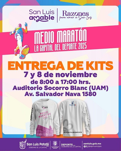 San Luis Potosí.– Este viernes 7 y sábado 8 de noviembre inicia la entrega de kits a los corredores que participarán en el Medio Maratón La Capital del Deporte 2025 a realizarse el domingo 9 de noviembre en punto de las 6:50 de la mañana.