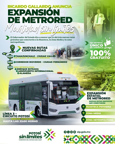 San Luis Potosí se consolidará con una movilidad sin límites, con las nuevas rutas del sistema gratuito MetroRed, dio a conocer el Gobernador de San Luis Potosí, Ricardo Gallardo Cardona, tras confirmar que durante el 2026 comenzarán a operar los recorridos de Tamazunchale a Ciudad Valles pasando por diferentes municipios, así como el corredor Rioverde–Ciudad Fernández y en la zona metropolitana desde Enrique Estrada, pasando por el Aeropuerto Internacional hasta la Alameda.